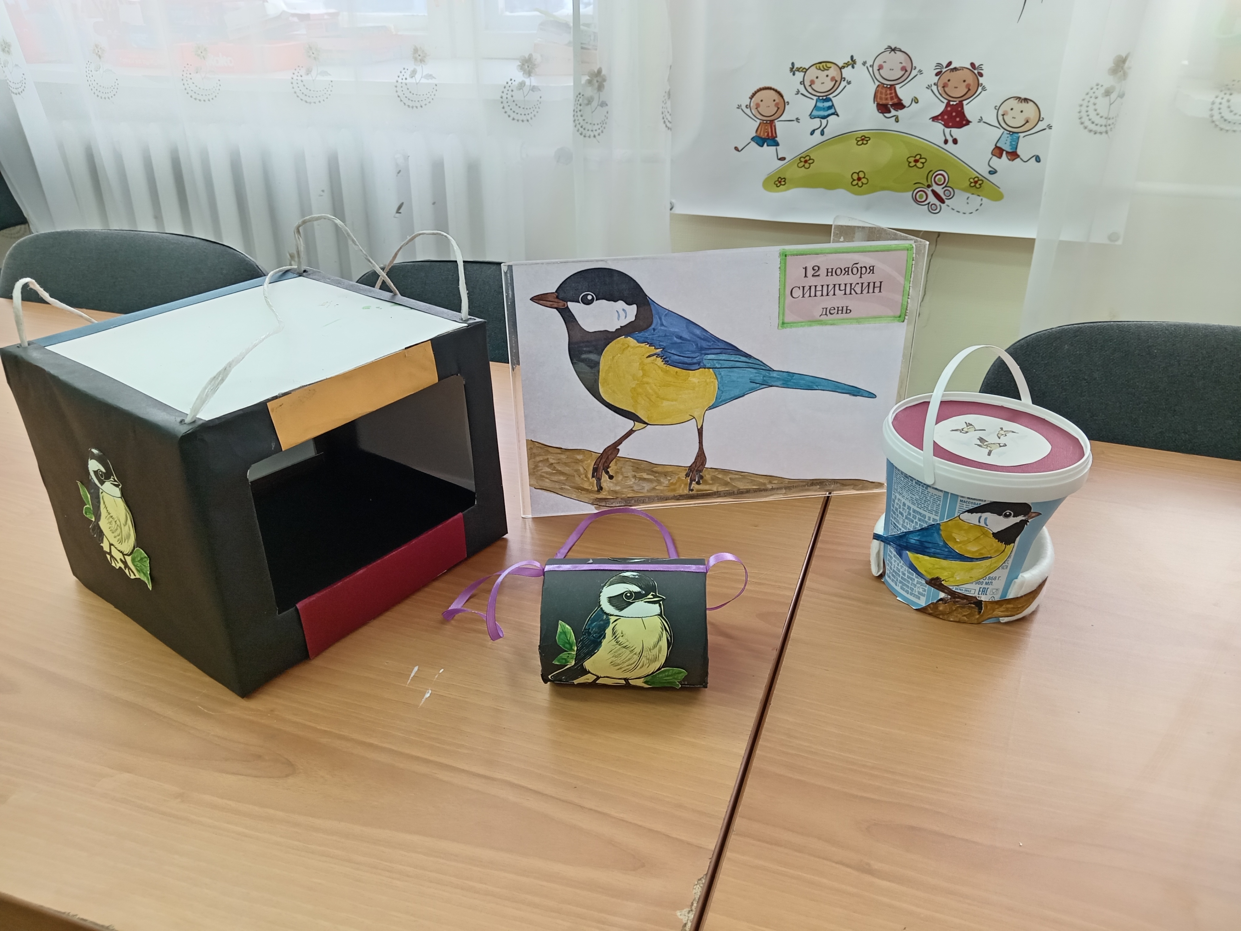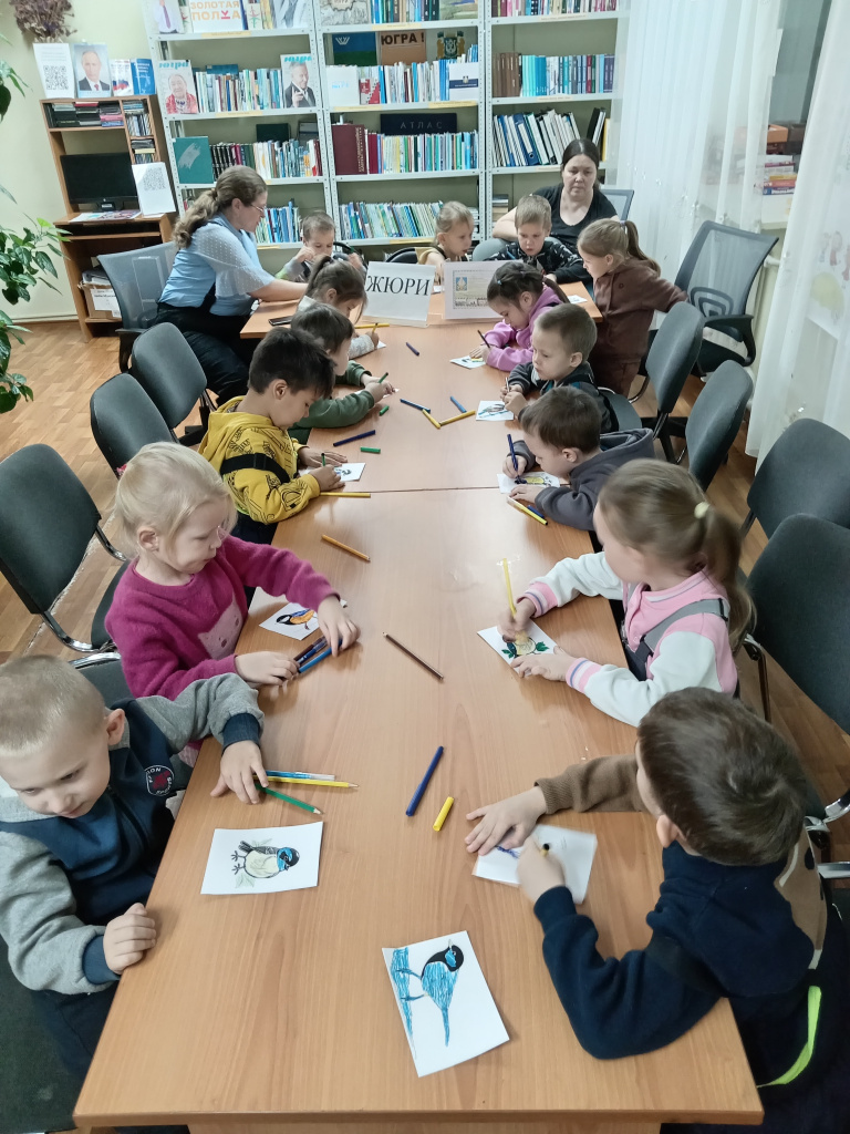 12 ноября отмечается еще экологический праздник – Синичкин день. Эти маленькие птички с ярким опереньем не оставляют равнодушных ни взрослых, ни детей. Библиотекарь Тимощук Зинаида рассказала детям, как и когда празднуется Синичкин день. Дети узнали, что с наступлением зимы птицам в нашем северном и суровом крае очень сложно выжить. Для этого человек должен прийти им на помощь и размещать для них кормушки, которые можно сделать из любого материала – картона, жестяной банки, ведерка от майонеза и т.д. Для яркости кормушек их можно украсить картинками, что и сделали дети, раскрасив синичку для кормушки.