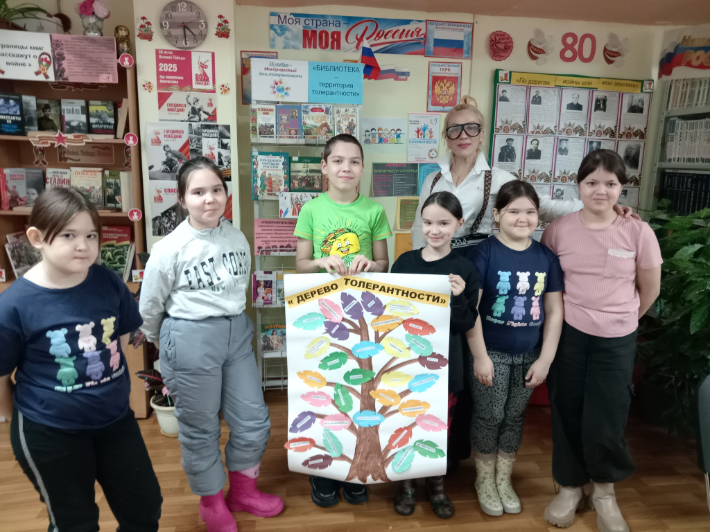 Символическим сердцем акции стало «Дерево толерантности», которое «выросло» практически в каждой библиотеке — от с. Батово до д. Ягурьях. Жители района, от малышей до старшего поколения, оставляли на его ветвях разноцветные ладошки-листочки с добрыми пожеланиями. Этот простой, но глубокий ритуал наглядно показал, как личные стремления к добру складываются в общее стремление к миру и согласию.