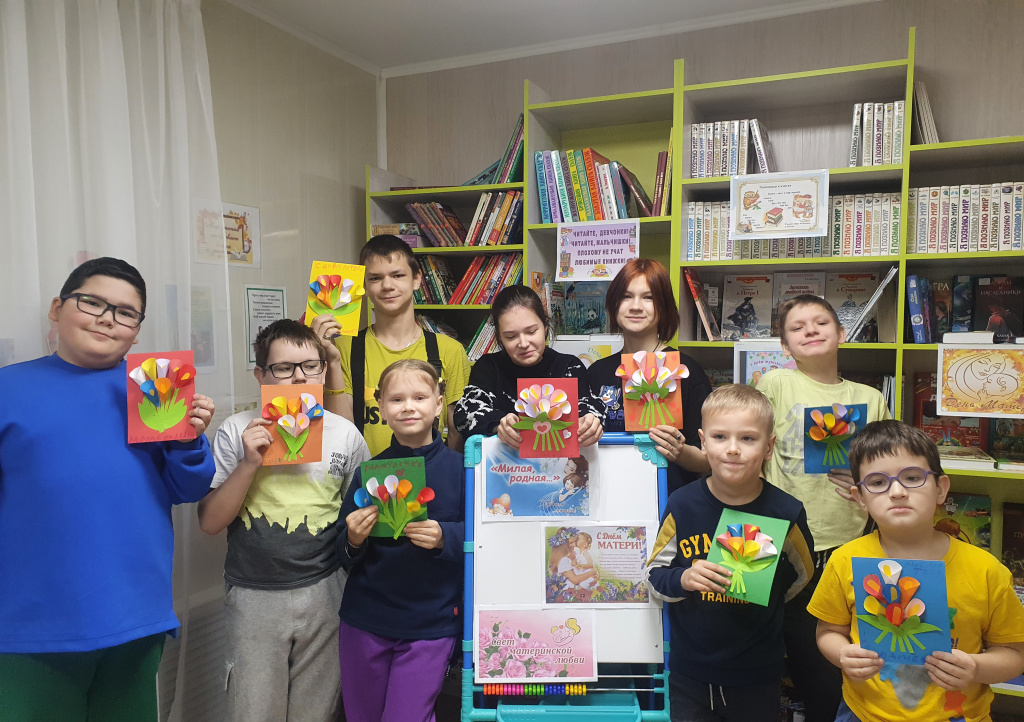 Библиотекарь Тамара Простакишина рассказала детям об истории праздника День Матери. После ее рассказа мальчишки и девчонки с удовольствием начали мастерить открытку из бумаги. Во время творческой работы дети общались и рассказывали про своих мам, какие они любимые и добрые. Изготовление открытки принесло много радости. Ребята смогли вложить в неё не только мастерство и терпение, но и талант, фантазию и, конечно же, любовь к родному человеку.